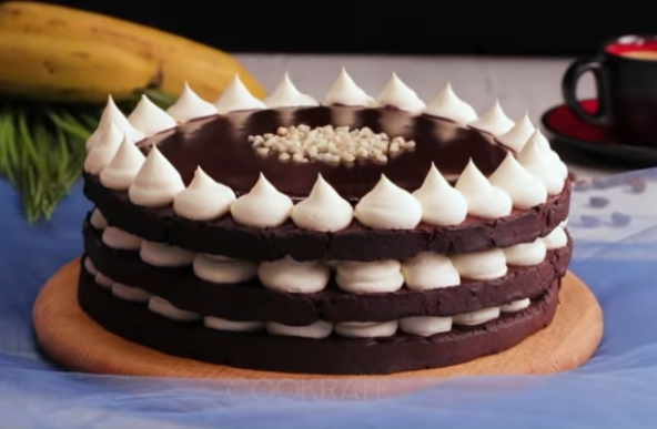 Keks i kakao pomešajte, a bananu ispasirajte, pa u nju dodajte istopljeni puter. Dobro sjedinite. Zatim pomešajte obe smese i dobro promešajte. Podelite na 3 jednaka dela. Svaki deo stavite u kalup prečnika 20 cm koji ste obložili pek papirom (treba da dobijete 3 kore). Lepo poravnajte i utisnite, pa stavite u frižider na sat vremena.
