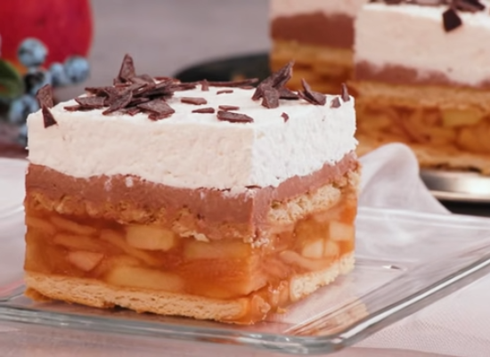 Jabuke isecite ka kriške, pa propržite u tiganju. Pred kraj dodajte rastvoren želatin i kuvajte još minut, dva. U tepsiju obloženu pek papirom poređajte keks umočen u mleko, a zatim sipajte gotove jabuke. Umutite maskarpone, pa dodajte istopljenu čokoladu (200 g). Sjedinite mikserom i sipajte preko jabuka. Umutite slatku pavlaku i sipajte preko. Ukrasite komadićima čokolade. Ostavite u frižideru 3 sata.
