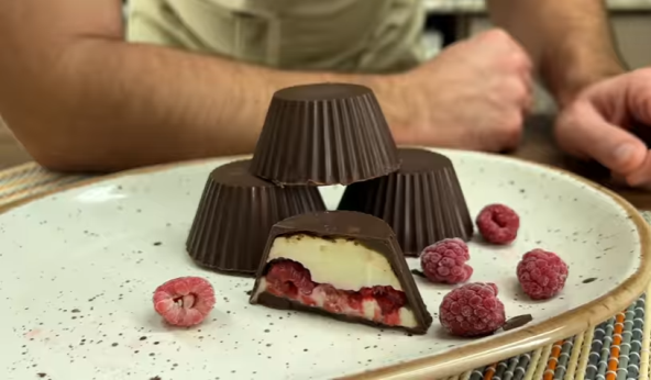 Rastvorite želatin u vodi i ostavite da nabubri. Čokoladu otopite pa uzmite silikonske korpice i stavite otopljenu čokoladu svuda po ivicama, ali i na dno korpice.Zatim tako namazane korpice ubacite u zamrzivač na 20 minuta. Za to vreme krem sir umutite sa želatinom, šećerom u prahu i vanilin šećerom. Zatim u korpice stavite po kašiku ovog fila, a preko fila stavite bobičasto voće po izboru, pa još jednu kašiku fila. Na kraju prekrijte preostalom čokoladom i stavite u frižider da se stegne. Pre služenja uklonite silikonske korpice.