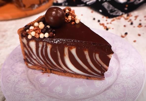 U kalup prečnika 26 cm obložen pek papirom poređajte keks na dno i uspravno po ivicama. U mleko dodajte gustin, ekstrakt vanile, kakao i šećer, pa sve dobro izmešajte i zagrevajte na laganoj vatri da dobijete gustu, ali glatku smesu, uz konstantno mešanje. Za beli fil ponovite postupak, samo što u njena ne dodajete kakao. Po sredini kalupa neizmenično ulivajte po malo od oba fila, trudeći se da van ostaju krugovi. Ovo radite dok ne potrošite sav fil. Stavite u frižider da se hladi oko sat vremena. Za glazuru šećer otopite u vodi zajedno sa gustinom i kakaom, na laganoj vatri uz mešanje. Na kraju dodajte crnu čokoladu i mešajte dok se potpuno ne otopi. Kada se malo prohladi prelijte preko torte i ravnomerno rasporedite. Neka se hladi u frižideru 3 sata pre služenja. Po želji je ukrasite čokoladnim bombonama.