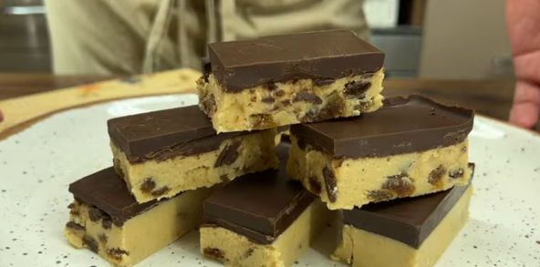 Suvo grožđe prelijte ključalom vodom i ostavite malo da odstoji. Kikiriki sameljite, pa mu dodajte omekšali puter i šećer u prahu. Mutite još malo da se sve sjedini. Suvo grožđe procedite pa osušite. Pomešajte sa prethodnom smesom pa je izlijte u četvrtasti kalup sa ivicama koje se skidaju. Lepo poravnajte pa odozgo prelijte istopljenu čokoladu. Stavite u frižider da se stegne. Uklonite ivice kalupa i isecite na štanglice.