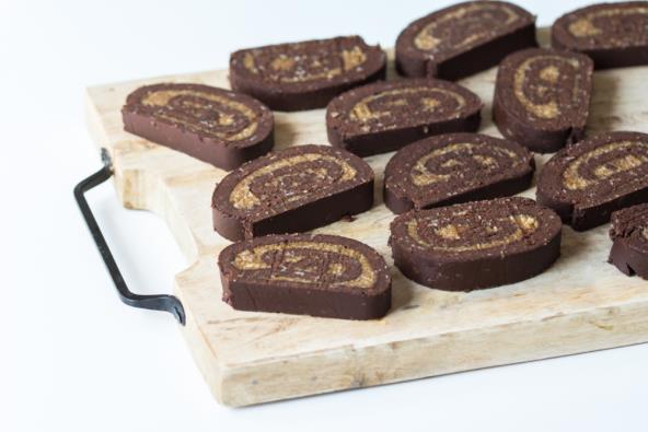 U šerpu stavite maslac, mleko, čokoladu i kafu, pa kuvajte na tihoj vatri sve vreme mešajući. Kada se čokolada i maslac otope, šerpu sklonite sa vatre, a onda dodajte mleveni keks i sve fino promešajte. Smesu ostavite da se ohladi, a onda je umesite. Na papir za pečenje prebacite smesu i razvucite je oklagijom u pravougaonik. Koru premažite čokoladnim kremom, a u posudi pomešajte kikiriki puter, šećer i kokosovo brašno. Dobijenu smesu nanesite preko krema. Urolajte zajedno sa papirom za pečenje i ostavite u frižideru najmanje 2 sata. Ohlađeni rolat secite na kriške željene veličine.
