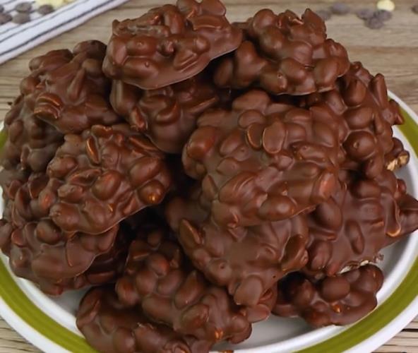 U šerpi pomešajte čokoladu i puter od kikirikija i lagano zagrevajte na tihoj vatri 15 do 20 minuta, povremeno mešajući. Kada se sastojci istope, sklonite šerpu sa šporeta i ostavite da se ohladi 5 minuta. Dodajte kikiriki, promešajte, a zatim kašikom uzimajte smesu i sipajte na pleh obložen pek papirom. Stavite u frižider na najmanje 30 minuta ili dok se slatkiši ne stegnu.