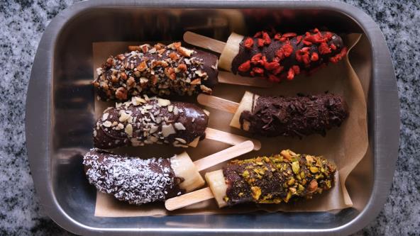 Svaku bananu prepolovite poprečno na pola i u svaku polovinu zabodite štapić. Stavite na tacnu, prekrijte plastičnom folijom i stavite u zamrzivač dok se ne smrznu, oko sat i po vremena. Otopite čokoladu u na laganoj vatri uz povremeno mešanje. Sipajte otopljenu čokoladu u visoku čašu. Sastojke za dekoraciju sipajte na odvojene tanjiriće. Svaku smrznutu bananu umočite u čokoladu, okrećući je da se dobro obloži, i odmah uvaljajte u kokos, keks i orahe, ili neki drugi sastojak po želji. Ređajte ih na tacnu prekrivenu papirom za pečenje, pa kada se čokolada stegne spremne su za jelo. Ukoliko ih nećete odmah jesti možete da ih vratite u zamrživač i da ih izvadite po potrebi.