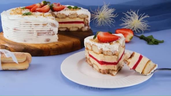 Između dva sloja belog fila nalazi se žele od jagoda, a sve je to prekriveno piškotama. Ovaj neodoljivi kolač koji osvežava nećete moći da odbijete, a njegova prednost je i to što se zaista lako pravi i uspeva iz prve. Ako niste vični u pravljenju poslastica, ne morate da brinete, jer će vam ovaj recept olakšati i dati samopouzdanje da možete sve da spremite. Poslužite sa domaćim sokom od nane.