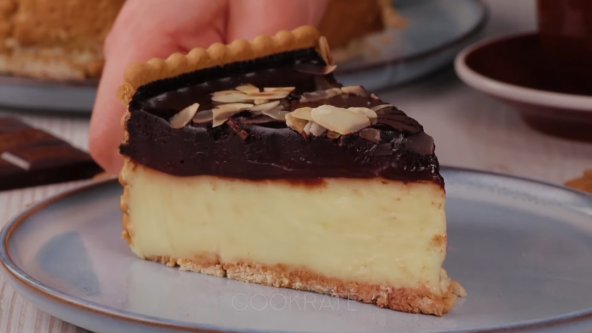 Kalup prečnika 20 cm obložite providnom folijom i po dnu i ivicama poređajte keks. Jaja, šećer, vanilin šećer, skrob i malo mleka umutite, pa sipajte preostalo mleko i promešajte. Kuvate, uz neprestano mešanje, dok se ne zgusne. Dodajte jogurt i sjedinite. Sipajte preko keksa i poravnajte. Stavite u frižider ili zamrzivač sat vremena. Pomešajte sve sastojke za glazuru, sem badema i putera. Kuvajte dok se svi sastojci ne sjedine, a onda dodajte i puter, pa kuvajte, uz mešanje, dok se ne otopi. Sipajte preko fila. Dekorišite bademovim listićima i vratite u frižider na pola sata.