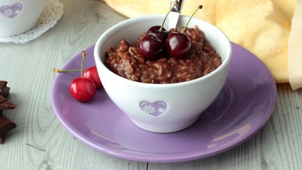 Pomešajte mleko, pirinač i šećer, pa kuvajte. Zatim postepeno dodajete seckanu čokoladu i mešajte dok se skroz ne otopi. Na kraju dodajete puter koji čekate da se otopi, isto uz mešanje. Ukrasite trešnjama ili nekim drugim voćem po želji.