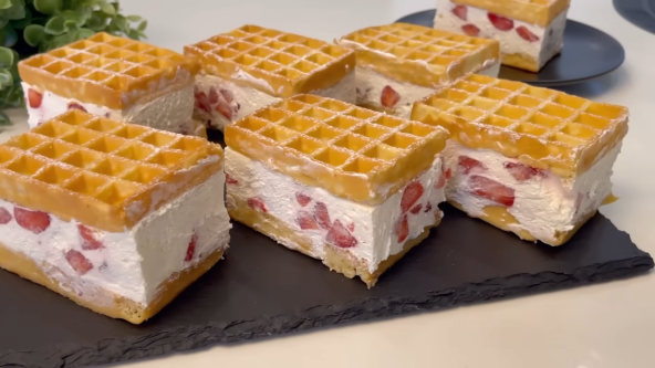 Umutite slatku pavlaku sa maskarpone sirom. Iseckajte jagode i dodajte u smesu, pa promešajte. Poređajte vafle (9 komada) na dno kalupa, pa sipajte smesu preko i poravnajte. Gore poređajte još jedan red vafla (9 komada). Pokrijte i stavite u frižider ili zamrzivač na 2-3 sata.
