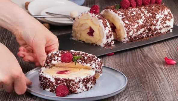 Umočite piškote u mleko i poređajte na providnu foliju (3 reda po 9 piškota). Umutite jaja sa šećerom i prstohvatom soli, zatim dodajte i skrob i dobro promešajte. Sipajte u mleko i kuvajte, uz neprestano mešanje, dok se ne zgusne. Ostavite da se ohladi na sobnoj temepraturi i premažite preko piškota. Poređajte maline i urolajte, pa stavite u frižider na sat vremena. Slatku pavlaku umutite sa šećerom, pa premažite kolač i pospite rendanom čokoladom. Ukrasite malinama i vratite u frižider na sat vremena.