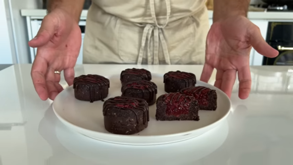 Urme prelijte kipućom vodom na 10 minuta. Maline pomešajte sa čiom, dodajte zaslađivač po ukusu (med, javorov sirup). Dodajte 3 kašike ključale vode i promešajte. Ostavite da deluje 10 minuta da čia seme nabubri. Ovsene pahuljice i bademe sameljite u blenderu. Zatim u blender dodajte kakao, biljno mleko,  očišćene urme i prstohvat soli. Umutite sve zajedno da se sjedini. Treba da dobijete gustu lepljivu masu. Istresite smesu u činiju. Navlažite ruke vodom pa uzimajte smesu i utiskujte u kalupe za mafine, ali praveći rupu u sredini. U te rupe sipajte smesu sa malinama. Stavite u frižider na 3-4 sata. Ukrasite čokoladom (opciono).