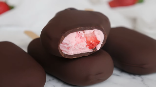 Par jagoda isecite na sitne komadiće, a preostale pomešajte sa šećerom i izblendirajte. Umutite slatku pavlaku i dodajte izblendirane jagode, pa promešajte. Zatim dodajte seckane jagode i lagano promešajte.  Sipajte u kalup za sladoled, pokrijte providno folijom i stavite štapiće u svaki kalup (preko folije). Ostavite u zamrzivaču 5 sati. Čokoladu istopite, pa ostavite da se ogladi 10-15 minuta. Umočite svaki sladoled u čokoladu.
