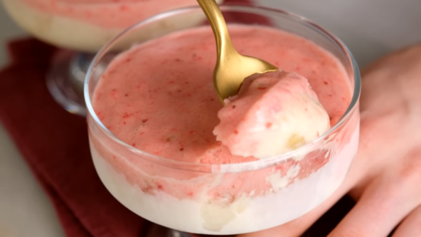 Banane iseckajte na kolutove i zamrznite na sat vremena. Zatim u blenderu (ili štapnim mikserom) umutite u kremastu smesu. Sipajte u činiju za serviranje, ali trećinu smese sačuvajte i nju umutite sa jagodama. Smesu sa jagodama sipajte preko smese od banana. Služite odmah.