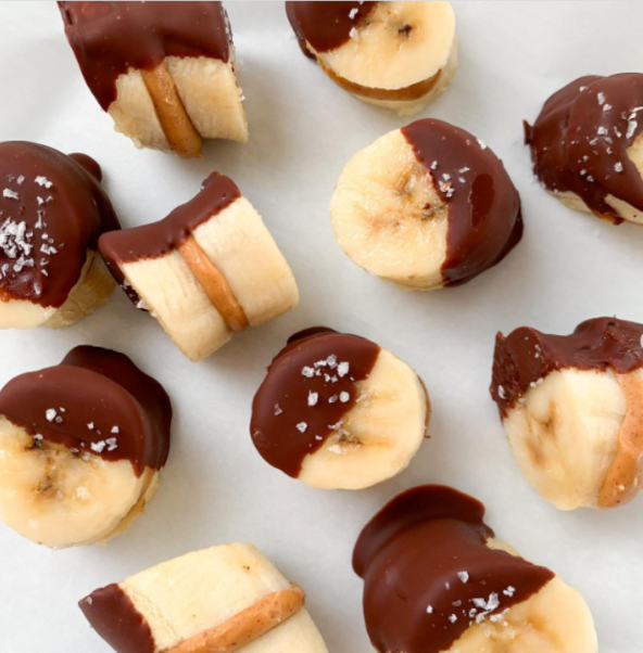 Isecite bananu na kolutove i stavite na tanjir obložen pek papirom. Zamrznite 30 min. Dodajte malu kašiku putera od kikirikija u svaku drugu krišku banane, a zatim dodajte ostale na vrh. Zamrznite još 30 min. Umočite u tamnu čokoladu otopljenu sa malo kokosovog ulja. Pospite morskom solju i čuvajte u zamrzivaču.