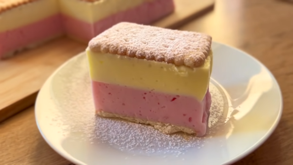 Želatin razmutite u vodi, pa pomešajte sa 300 g jogurta. Dobro sjedinite. Po dnu kalupa poređajte keks, a preko sipajte roze fil od jagoda. Stavite u frižider na sat vremena. Providni želatin razmutite sa vodom, a zatim dodajte limunov sok ili kap žute boje, ako želite da bude jača boja fila. Promešajte, pa dodajte preostalih 300 g jogurta. Sipajte preko roze fila, poređajte keks na vrh i vratite u frižider na sat vremena. Pospite šećerom u prahu.