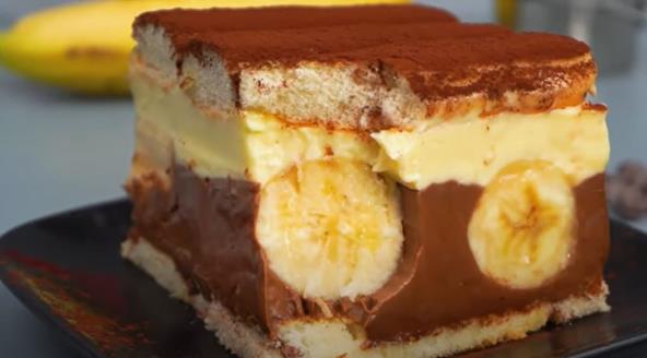 Čokoladni fil: U vruće mleko dodajte šećer i puding pa kuvajte uz stalno mešanje dok se ne zgusne. Sklonite sa ringle i umešajte puter i čokoladu. Stavite da se ohladi pa prelijte preko piškota. odozgo stavite banane isečene na pola.