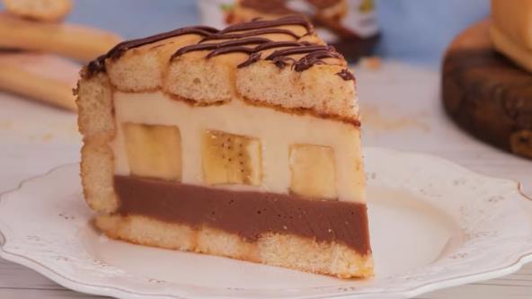 Okrugli kalup sa odvojivim obručem obložite piškotama umočenim u mleko i po dnu i po ivicama. Umutite jaja sa šećerom, vanilin šećerom i 100 ml mleka. U šerpu sipajte ostatak mleka, dodajte ovu mešavinu i brašno pa sve izmešajte žicom. Stavite da se zagreva, dodajte belu čokoladu i kuvajte dok se ne zgusne fil. Ohladite na sobnoj temperaturi. Potom stavite puter i umutite. Podelite na 2 dela i u jedan umešajte nutelu. Fil sa nutelom sipajte preko piškota, ali ostavite malo za ukrašavanje. Stavite u frižider da se stegne. Zatim banane isecite na deblje kolutove i prekrijte fil od nutele. Preko banana sipajte fil od bele čokolade, pa ponovo tortu "zatvorite" piškotama umočenim u mleko. Stavite u frižider na 2 sata. Kada se stegne preostalim filom od nutele uz pomoć šprica ukrasite tortu.