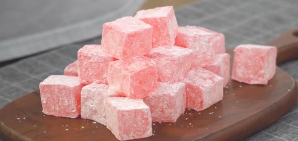 U šerpicu sipajte šećer, vodu i limunov sok. Stavite na ringlu i kuvajte 15 minuta na umerenoj vatri dok se šećer ne otopi. Sklonite sa ringle. U drugoj šerpici pomešajte skrob, vinski prašak za pecivo i prelijte sa 575 ml vode. Stavite na ringlu i konstantno mešajte dok smesa ne postane gusta. Zatim postepeno dodajte prethodnu smesu i konstantno mešajte. Krčkajte pola sata na laganoj vatri. nakon toga dodajte aromu vanile i boju za hranu. Umešajte. Četvrtast kalup obložite papirom za pečenje i četkicom umočenom u ulje premažite. Izlijte smesu. Nakon 3 h istresite iz kalupa i isecite na kocke. Uvaljajte u kukuruzni skrob.