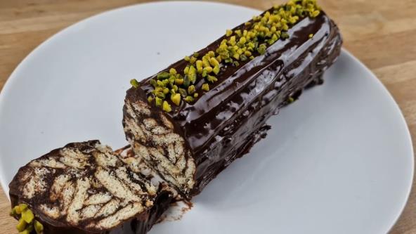 U činiji izlomite keks. U šerpici pomešajte šećer, kakao i mleko. Mešajte i kuvajte na laganoj vatri dok ne provri. Dodajte kašiku putera i još 50 g čokolade pa dobro promešajte da se otopi. prelijte preko keksa i promešajte. Na radnu površinu stavite providnu foliju, istresite masu i uz pomoć folije oblikujte u salamu. Stavite na 3 sata u frižider. Preostalo čokoladu izlomite i prelijte zagrejanom slatkom pavlakom. Izmešajte. Prelijte kolač čokoladom i ukrasite po želji.
