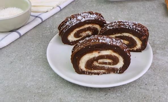 U činiju sa keksom dodati puter (otopljen), kakao prah, šećer, mleko i mešati da se dobije čvrsto i homogeno testo. Umotajte prozirnom folijom i stavite u frižider na najmanje 30 minuta. U činiju dodajte maskarpone, grčki jogurt, šećer u prahu i kokos pa mešajte dok se sve dobro ne sjedini. Posle 30 minuta izvadite testo iz frižidera i stavite ga na list prozirne folije. Razvucite testo da dobijete ujednačenu debljinu od nekoliko milimetara. Odozgo premazati kremom od lešnika pa pripremljenom kokos smesom i dobro poravnati. Zamotajte ga uz pomoć prozirne folije koja je ostala ispod. Umotajte ga prozirnom folijom i stavite u frižider na najmanje 5 sati. Po isteku vremena izvaditi iz frižidera i ukrasiti rolat kremom od lešnika i kokosom.