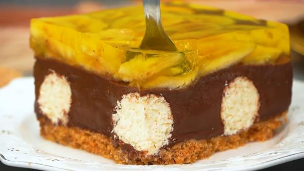 Mleveni keks pomešajte sa istopljenim puterom i utisnite u kalup. Stavite u frižider na 20 minuta. Kakao, šećer i skrob pomešajte sa 100 ml mleka, a ostatak sipajte u šerpu. Dodajte kakao koji ste lepo promešali, da nema grudvice, u mleko i kuvajte uz mešanje, dok se ne zgusne. Zatim dodajte puter i mešajte dok se ne otopi. Pola smese sipajte preko keksa. Krem sir pomešajte sa kokosom i oblikujte kuglice. Poređajte preko čokolade, pa prelijte ostatkom fila. Stavite u frižider na 40 minuta. Zatim pomešajte vodu i želatin i ostavite da se stegne. Poređajte isečene banane, pa prelijte želatinom koji ste otopili na pari. Ohladite 2 sata i servirajte.