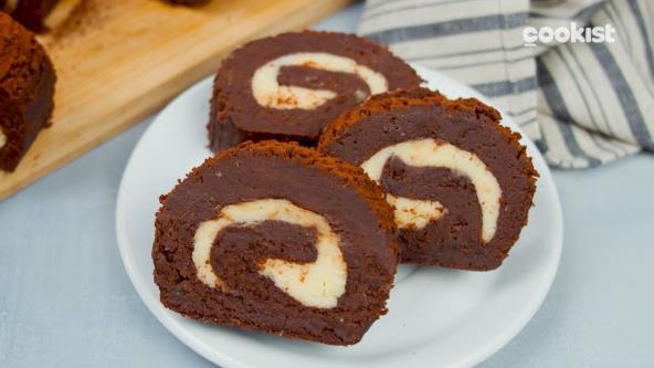 U međuvremenu umutite omekšali puter sa šećerom u prahu i kafom dok ne postane kremasto. Razvaljajte testo od kestena na komadu papira za pečenje formirajući pravougaonik. Odozgo premažite dobijenim filom. Podlogu od kestena umotajte u rolnu i umotajte u pek papir. Ohladite 1 sat, a zatim ukrasite kakao prahom i isecite na komade.