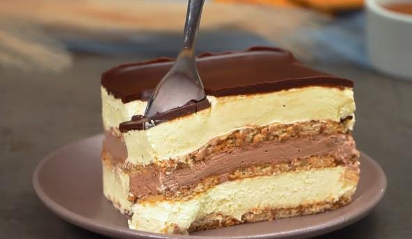 U 150 ml mleka rastvoriti neskvik pa umakati keks. Četvrtast pleh obložite providnom folijom pa ređajte keks po dnu. U šerpu stavite prašak za puding, jaja, šećer, mleko. Promešajte žicom i stavite da se zagreva dok ne počne da se zgušnjava. Zatim sklonite sa ringle, ubacite puter i umutite. zatim dodajte i umućen šlag pa sve umutite mikserom da se dobro sjedini. Podelite fil na dva dela i u jedan umešajte rastvoren neskvik u mleku ili vodi. Preko keksa stavite pola belog fila, poravnajte. Još jedan red keksa pa neskvik fil. Zatim još jedan red keksa i ostatak belog fila. Stavite u frižider na sat vremena. Nakon toga rastopite čokoladu za glazuru i prelijte tortu. Vratite u frižider na još pola sata.