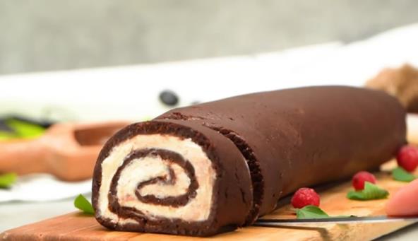 Keks izblendirajte, pa dodajte kakao i mleko. Zatim sjedinite sastojke i oblikujte loptu, pa umotajte u providnu foliju. Stavite u frižider na 15 minuta. Izvadite testo i folije, pa na radnoj površini razvucite drugu foliju, stavite testo i preko opet foliju. Zatim razvucite u obliku pravougaonika i skinte gornju foliju. Pomešajte krem sir, šećer u prahu i vanilu i premažite preko kore. Urolajte i dobro zatvorite, pa stavite u frižider na sat vremena.