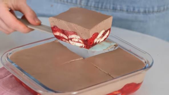 Keks poređajte u posudu, a u šerpu sipajte šećer, pa dodajte jagode. Mešajte dok se ne istopi šećer, pa sipajte preko keksa. Želatin pomešajte sa vodom i ostavite da nabubri. Za to vreme umutite krem sir i kakao, pa dodajte umućenu slatku pavlaku i sjedinite mikserom. Zatim želatin otopite na pari, pa dodajte u fil sa krem sirom i umutite. Sipajte preko jagoda. Stavite kratko u frižider.
