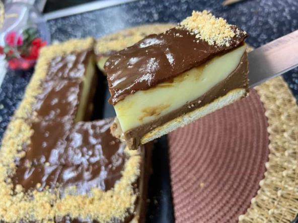 U kalup koji ste obložili providnom folijom (i ivice i dno) poređajte keks. U mleko dodajte šećer, žumance, puding od vanile, brašno i skrob. Dobro promešajte i kuvajte dok se ne zgusne, uz neprestano mešanje. Podelite na 2 jednaka dela, još dok je vruć, pa u jedan dodajte čokoladu i mešajte dok se ne istopi. Preko keksa sipajte prvo čokoladni fil, pa poravnajte, a onda sipajte i fil do pudinga i poravnajte. Pokrijte providnom folijom i stavite u frižider na 2 sata. Pomešajte čokoladu i mleko i otopite, pa prelijte preko kolača. Ako želite ukrasite mlevenim keksom, pa stavite u frižider na 10 minuta da se stegne.