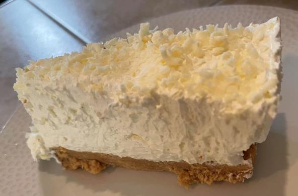 Mleveni keks pomešajte sa istopljenim puterom i mlekom, pa utisnite u dno kalupa. Stavite u frižider dok pripremite fil. U posudi pomešajte mleko, slatku pavlaku, šećer i puding, pa sve mutite tačno 5 minuta, na najjačoj brzini. Sipajte fil preko keksa i poravnajte. Ukrasite belom čokoladom i ostavite u frižideru oko 2-3 sata.