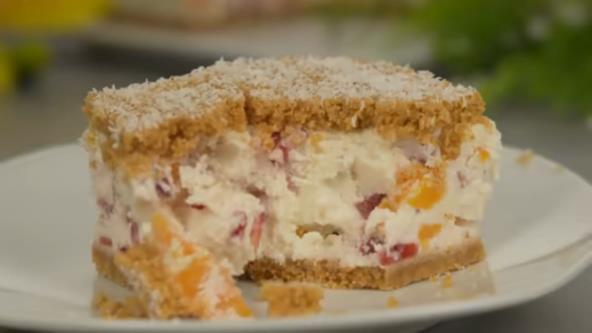 Mleveni keks pomešajte sa istopljenim puterom, pa pola količine sipajte u kalup i dobro utisnite. Umutite krem sir sa šećerom, pa dodajte slatku pavlaku i nastavite da mutite. Zatim dodajte seckane breskve, koje ste procedili, kao i seckane jagode. Promešajte. Mleko i želatin pomešajte, pa kuvajte dok ne priključa. Sklonite sa šporeta, pa sipajte malo fila u mleko i promešajte, a onda sve to sipajte nazad u fil i dobro sjedinite. Sipajte preko keksa, poravnajte, pa preko pospite preostali mleveni keks. Oshladite u frižideru 2 sata, pa pospite kokosom i služite.