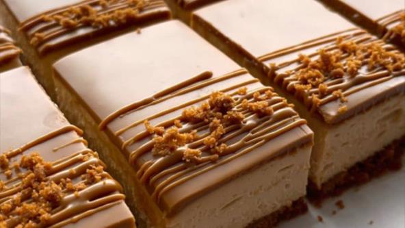 Mleveni keks pomešajte sa istopljenim puterom i dobro sjedinite. Od dobijene smese odvojite 2 kašike, a ostatak utisnite u tepsiju pravougaonog obilka, koju ste obložili pek papirom. Stavite u frižider na 20 minuta. Krem sir umutite sa kikiriki puterom, šećerom i vanilin šećerom. Dodajte slatku pavlaku i opet dobro umutite. Sipajte fil preko keksa, poravnajte, pa pokrijte providnom folijom i ostavite u frižideru preko noći. Preko sipajte karamel preliv i ponovo ostavite u frižideru sat vremena. Isecite, pa svaki kolač ukrasite karamel prelivom i pospite mlevenim keksom koji ste odvojili sa strane. Prijatno!