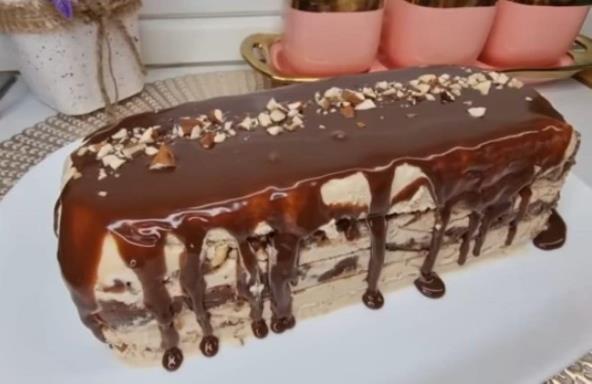 Keks izdrobite, a kikiriki iseckajte. Zatim u posudi umutite slatku pavlaku, pa dodajte kondenzovano mleko i nastavite da mutite. Kafu razblažite sa vrelom vodom, pa dodajte u smesu. Sjedinite mikserom, a nakon toga otopite čokoladu sa mlekom. Kalup obložite providnom folijom, pa sipajte malo fila od kafe, preko pospite keks i kikiriki, a onda prelijte čokoladom. Opet sipajte fil, pospite keksom i kikirikijem, pa prelijte čokoladom. Preko sipajte fil, pospite keksom i kikirijem, pa opet još jedan sloj fila. Pokrijte providnom folijom i stavite u zamrzivač da se stegne. Izvadite sladoled i ako želite prelijte čokoladom i ukrasite kikirikijem.