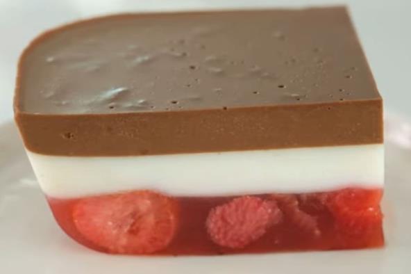 U šerpi pomešajte jagode, šećer, želatin i vodu. Kuvajte dok ne krene da ključa, uz neprestano mešanje. Sipajte u vatrostalnu posudu, lepo poravnajte i stavite u frižider da se stegne. U drugu šerpu sipajte mleko, šećer i želatin, pa kuvajte dok ne krene da ključa, a nakon toga ostavite još 3 minuta. Neprestano mešajte. Sipajte fil preko onoga sa jagodama i vratite u frižider. Nemojte ceo mlečni fil da potrošite ostavite oko 100 ml da istopite čokoladu. Kada istopite čokoladu sa mlekom, sipajte preko mlečnog fila i opet vratite u frižider na sat vremena da se stegne.