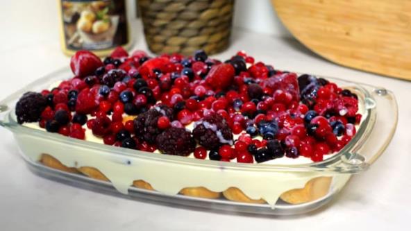 Umutite slatku pavlaku i maskrapone, pa dodajte šećer u prahu i sjedinite mikserom. Voće odmrznite, pa procedite višak vode. U vatrostalnu posudu poređajte keks, preko sipajte fil, a onda poređajte voće. Poslužite.