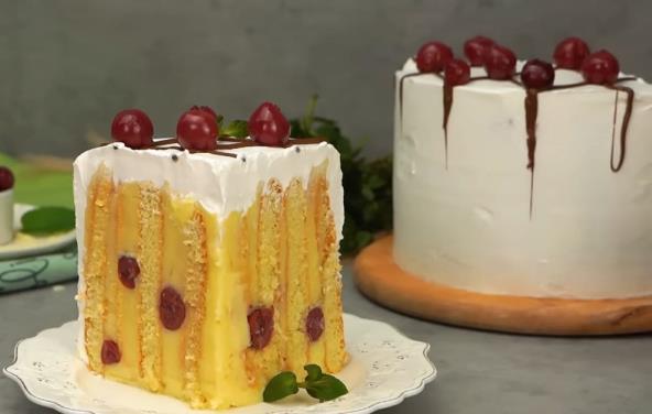 Napomena: Ako vam ova priprema deluje komplikovano, možete piškote da poređajte uspravno u kalup, pa da sipate pola količine fila, zatim višnje, opet fil i na kraju višnje.