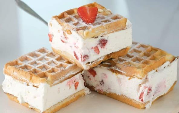 U tepsiju u obliku kvadrata poređajte 4 vafla ili bakina kolača. Umutite krem sir sa šećerom u prahu i dodajte umućenu slatku pavlaku. Dobro sjedinite mikserom, pa dodajte seckane jagode i promešajte. Sipajte fil preko i poravnajte, a onda opet poređajte 4 vafla ili bakina kolača. Stavite u frižider na 2 sata, pa pospite šećerom u prahu i služite.