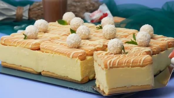 Poređajte piškote na dno kalupa ili tepsije. Umuitite jaja sa šećerom i vanilin šećerom, pa dodajte skrob i mleko. Sve dobro sjedinite, tako da nema grudvica, pa kuvajte dok se ne zgusne, uz neprestano mešanje. Pokrijte providnom folijom i ostavite da se ohladi nekih 30 minuta. Sipajte fil u neku posudu i dodajte krem sir, pa dobro umutite. Sipajte kokos i lagano umešajte. Dobijeni fil sipajte preko piškota i poravnajte, pa poređajte još jedan red keksa. Stavite u frižider na 2 sata. Otopite belu čokoladu sa uljem, pa dekorišite tortu i stavite u frižider na još 10 minuta. Ukrasite rafaelo kuglicama i nanom.
