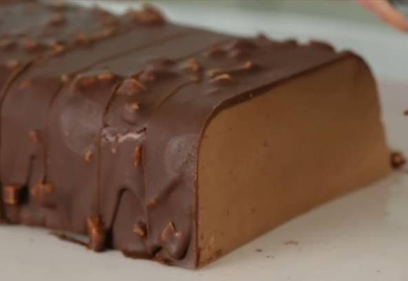 U mleko dodajte želatin i stavite da se zagreje, pa dodajte čokoladu. Mešajte dok se ne istopi, pa kada proključa ostavite još 3 minuta. Sipajte u vatrostalnu posudu dimenzija 26x12x10 cm (ili približnih dimenzija). Dobijenu smesu sipajte u posudu, pa stavite u frižider na 2 sata ili u zamrzivač na sat vremena. Istopite čokoladu sa lešnicima sa uljem i prelijte preko kolača i ostavite 15 minuta u frižideru da se stegne.
