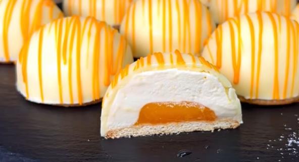 Oljuštene kriške mandarine dobro izblendirajte, pa procedite kroz sito. U posudi pomešajte šećer i skrob, pa dodajte u mandarine i dobro sjedinite da ne ostanu grudvice. Kuvajte dok se džem ne zgusne, uz neprestano mešanje. Ostavite da se džem ohladi. Istopite belu čokoladu, pa uzmite gumeni kalup u obliku manjih polulopti. Premažite svaku istopljenom čokoladom, pa stavite u zamrzivač na par minuta. Zatim premažite još jedan sloj čokolade. Vratite u zamrzivač na još par minuta. U posudi pomešajte vodu i želatin i ostavite da nabubri. Umutite slatku pavlaku sa šećerom u prahu, pa dodajte džem od mandarine (ostavite malo za punjenje sitnih kolača). Zatim promešajte i dodajte istopljeni želatin. SIpajte fil u kalup za kolače, pa kašikom napravite malo uduljenje u koje ćete sipati preostali džem. Zatvorite keksom i stavite u frižider na 2 sata. Ukrasite sitne kolače džemom od mandarine ili istopljenom čokoladom.