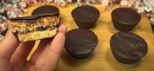 Izblendirajte keks, pa dodajte otopljen puter i dobro sjedinite dva sastojka. Iseckajte bananu, pa dodajte limunov sok, ispasirajte, a onda dodajte puter od kikirikija. Čokoladu otopite na pari. U 6 silikonskih modlica za kolačiće stavite po 1 kašiku čokolade i razmažite je po ivicama uz pomoć četkice za premazivanje. Potom silikonske modlice stavite u kalup za mafine, pa u frižider na 5 minuta da se stegne čokolada. Premažite rupice ostatkom čokolade, pa ponovo vratite u frižider na 5 minuta. Dodajte po kašiku keksa, pa utisnite čašicom. Na keks rasporedite po kašiku voćnog džema. Dodajte po kašiku ispasirane banane, pa preko svakog sitnog kolača nanesite otopljenu čokoladu. Špatulom poravnajte čokoladu po vrhu, pa stavite sitne kolače u frižider na 1-2 sata da se stegne. Preporučujemo i posne bajadere sa orasima