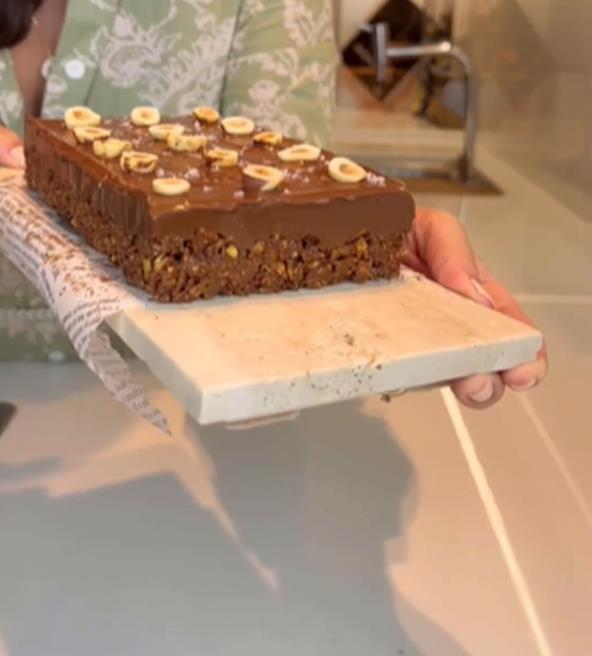Smesu za meki deo istopite i prelijte preko hrskave smese. Ostavite u frižideru dva sata, potom izvadite iz kalupa i ukrasite sa još oraha ili lešnika. Uživajte u hrskavom čokoladnom kolaču.