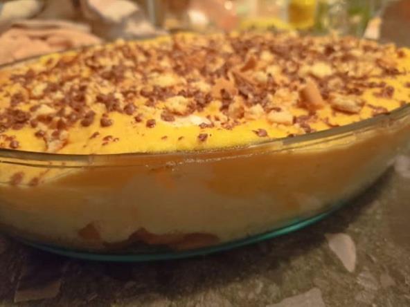 Sve unapred pripremite, jer se sve radi jedno za drugim. Umutite žumanca sa šećerom i vanilin šećerom, pa ostavite sa strane. U posudu poređajte keks (ostavite nekoliko komada za dekoraciju).