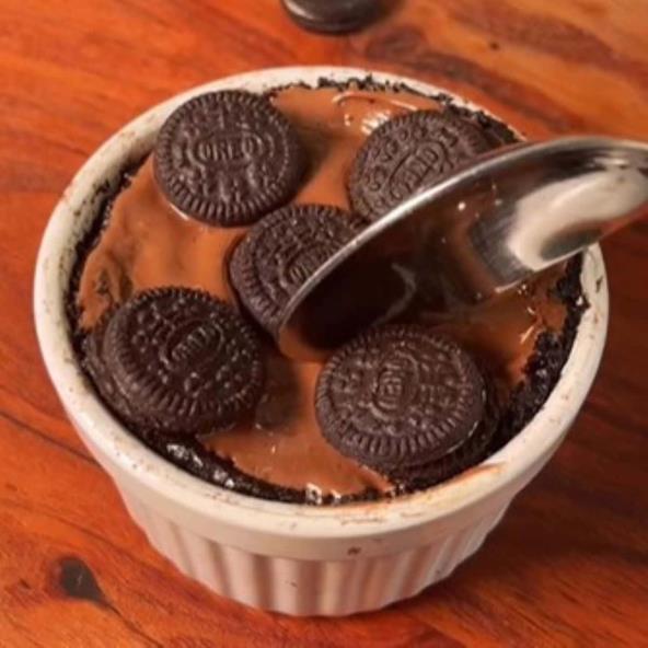 Pecite u mikrotalasnoj jedan minuta. Prelijte istopljenom nutelom i ako želite ukrasite oreo keksom.