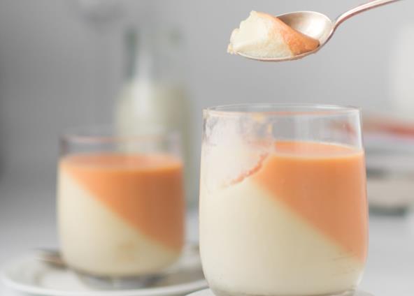 U međuvremenu, pospite 3/4 kašičice želatina preko 30 ml soka od pomorandže i ostavite da odstoji dok želatin ne omekša, oko 10 minuta. Ostružite želatin od narandže u malu šerpu i ostavite na laganoj vatri, mešajući, dok se ne istopi. Umešajte preostal soka od pomorandže. Sipajte želatin od narandže u čaše i ostavite u frižideru dok se potpuno ne stegne, najmanje 1 sat.