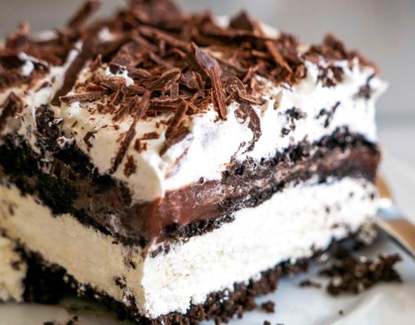 Preko sloja pudinga nanesite šlag. Pospite komadićima čokolade. Pokrijte pleh i ostavite u frižideru najmanje 3 sata. Isecite na kvadrate i servirajte. Možda ćete želeti da napravite i čizkejk sa breskvama.