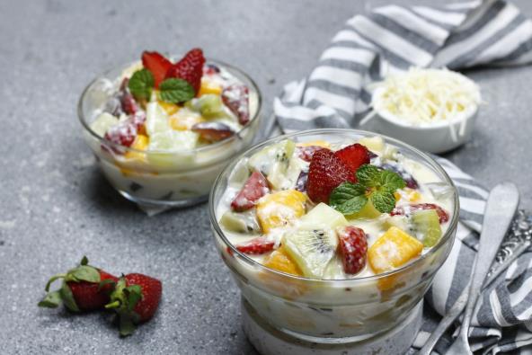 U drugoj velikoj posudi pomešajte jabuke, kivi, breskve, jagode i banane. Dodajte jednu kašiku iseckanih badema, kao i dve kašike seckanih indijskih oraha. Promešajte. Ubacite krem u male činije, rasporedite odozgo mešavinu voća i orašastih plodova i uživajte. Možete i da ohladite u frižideru pre serviranja. Možda ćete želeti da napravite i tradicionalni italijanski zabajone krem sa jagodama.