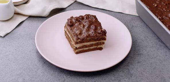 Poređajte čokoladni keks u jednom redu po dnu kalupa za pečenje. Premažite pripremljenom kremastom mešavinom. Ponovite postupak sa još dva sloja keksa i krema. Da biste napravili preliv, istopite čokoladu i slatku pavlaku, a zatim umešajte lešnike.