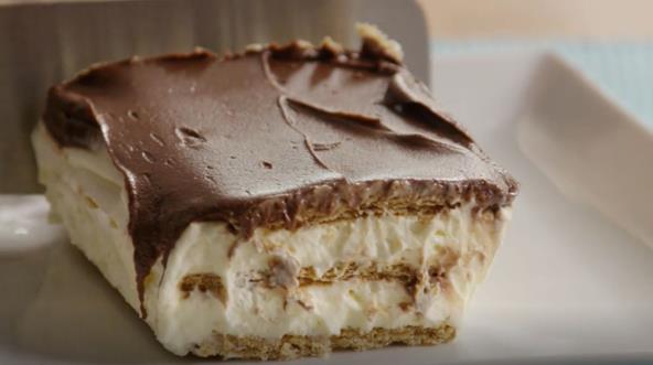 Odozgo stavite završni sloj keksa. Stavite u frižider na 30 minuta. Ohlađenu tortu premažite otopljenom čokoladom. Ponovo pokrijte najlonskom folijom i ohladite najmanje 3,5 sata pre serviranja. Uživajte! Možda ćete želeti da napravite i kolač sa švapskim sirom.