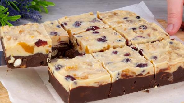 Ako volite kombinaciju tamne i bele čokolade sa hrskavim orasima i osvežavajućim suvim voćem, ovaj desert će vas oduševiti. Spoj intenzivne arome kafe, orašastih plodova i blago kiselkastih nota brusnica i kajsija stvara savršen balans ukusa. Jednostavan je za pripremu, ne zahteva pečenje i idealan je za serviranje uz popodnevnu kafu ili kao slatki poklon za drage ljude.